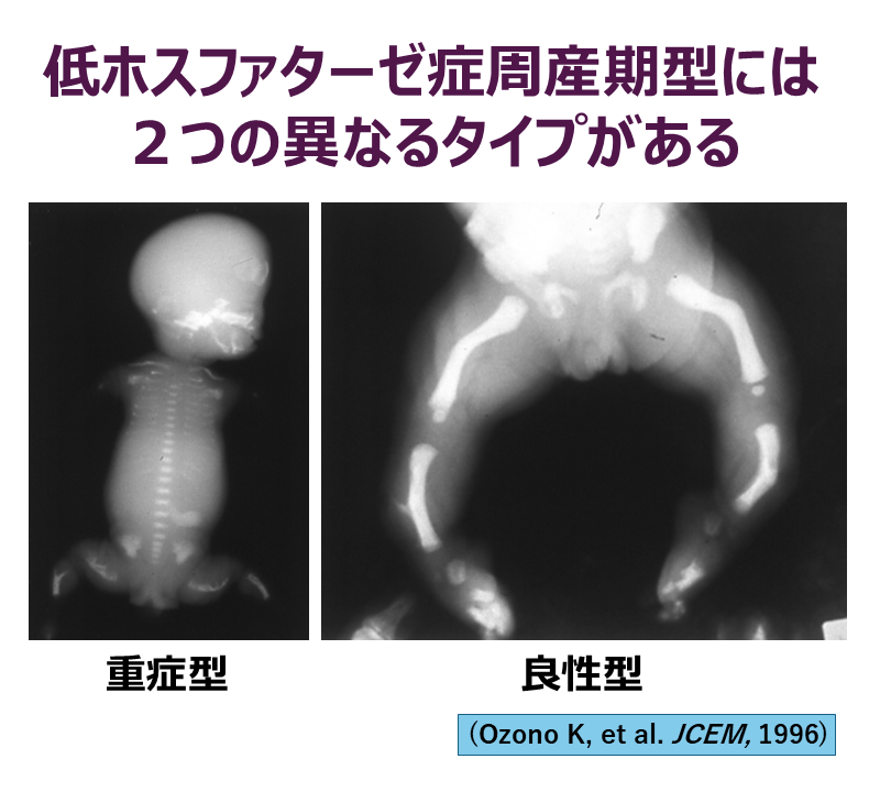しかし、平成3年(1991年)に帰国した時には、清野先生は岡山大学の小児科教授として転出されており、教室の主たるテーマは先天代謝異常になっていました。心機一転、小児科から病理検査の方に変わろうと思い、平成4年(1992年)、大阪府立母子保健総合医療センター検査科診療主任として赴任しました。当時の母子センターは出生数が多く、胎児新生児死亡により解剖となるケースも多くありました。そこで、骨・軟骨疾患に関わる症例を一手に引き受けて、経験を蓄積しました。また、低ホスファターゼ症(HPP)の出生前診断を行ったのも重要な経験となりました。当時、胎児期に発症するHPPは予後不良であるとされておりましたが、胎児期発症の本症例では、私は分娩にも立ち会いましたが、呼吸確立も順調であり生命予後は問題ありませんでした(この方はもう成人になっておりますが、今でも私の外来に通っています)。似たような症例を複数経験し、のちにHPP周産期良性型という病型を確立しました(図1)。当時、同センターの総長としておられた松本圭史先生(病理学、内分泌学)のご推挙があり、1994年に大阪府立母子保健総合医療センター研究所環境影響部門部長に就任しました。その際、今後の研究テーマとして、従来行ってきましたビタミンD・カルシウム研究に、当時、まだ研究分野として黎明期にあった軟骨代謝の研究を加えました。共同研究などを通じて、24水酸化酵素遺伝子のビタミンD応答配列の同定、軟骨細胞に分化誘導可能なACTD5細胞とジーントラップ法を組み合わせて軟骨特異的発現遺伝子の同定などを行いました。一方では、サイドジョブ的に、骨系統疾患の遺伝子診断や病態解析なども行いました。リン代謝も研究課題に加え、米田俊之教授のもとに留学し教室に加わった道上敏美先生がこの方面の研究を発展させてくれました。