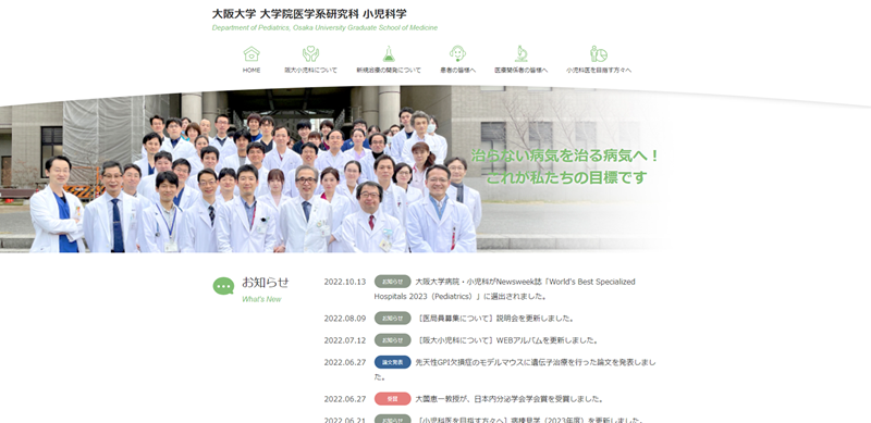 PIとしての研究はやりがいもありましたが、プレッシャーも大きかったです。大阪母子センターの研究所には外部評価という仕組みがあり、岡田善雄先生、豊島久真男先生、岸本忠三先生、曲直部寿夫先生など錚々たるメンバーが評価委員としておられ、研究内容やその方針について、叱咤激励をしていただきました。その甲斐もあって、関口清俊先生、吉田進昭先生、松居靖久先生などが大学の教授になり(のちには長澤丘司先生)、私も2002年に大阪大学大学院医学系研究科教授に就任しました。小児科学教室の教授として、「治らない病気を治る病気へ」という目標を掲げ、治験を積極的に行い、薬剤の開発に取り組みました(図2)。